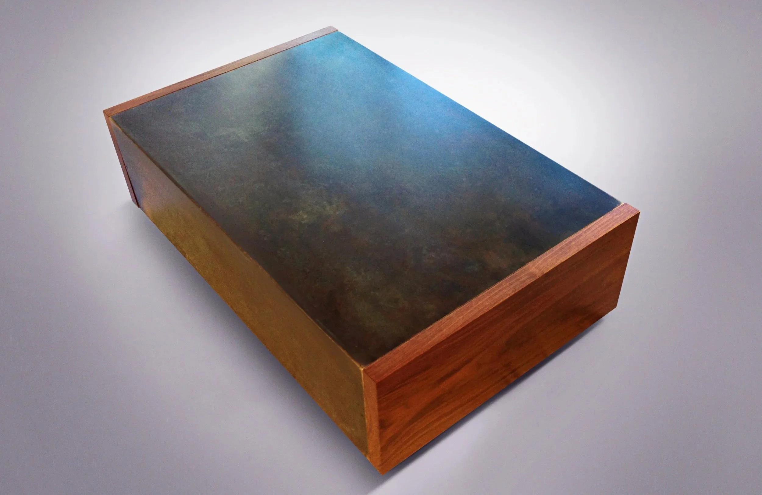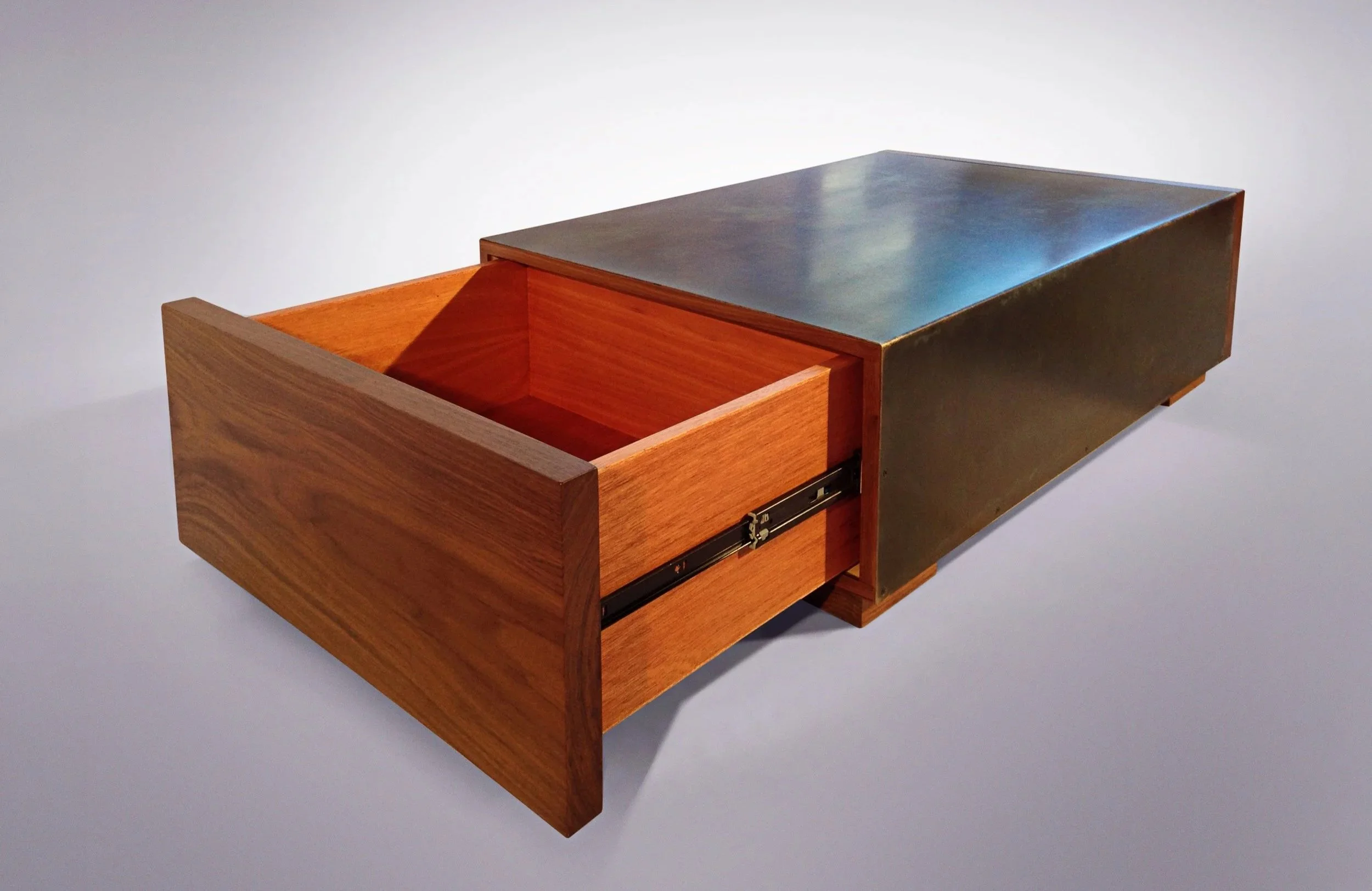 The show-stopping Orthos coffee table hides its brilliant secret at both ends. Two full-sized wooden drawers open to provide a vast amount of hidden storage. And while the table is extremely functional, the beauty of Orthos will command the center of any room. A large sheet of bronze is wrapped around a Mahogany plywood cabinet, then finished with solid-wood drawer facades at either end. The Orthos is available in Mahogany, Oak, or Walnut, with several finish options for the bronze. Custom finishes and alternate sizes are available upon request. Solid wood with plywood and bronze construction. Please inquire about prices